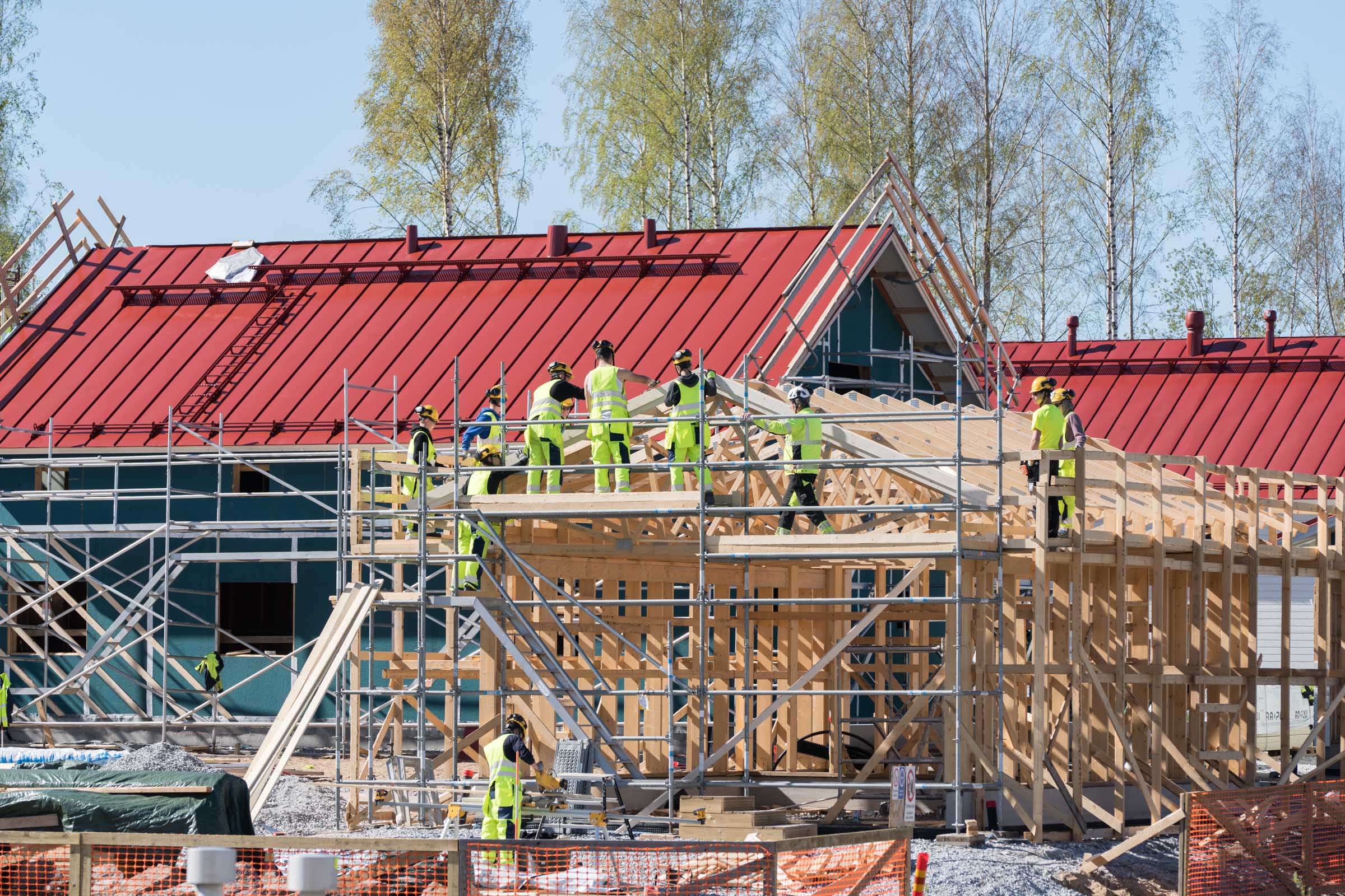 - ERakennusten perustus- ja runkotyöt, seinien ja lattioiden asennus, muuraus, betonointi, viimeistelytyöt, kuten maalaus ja listoitus